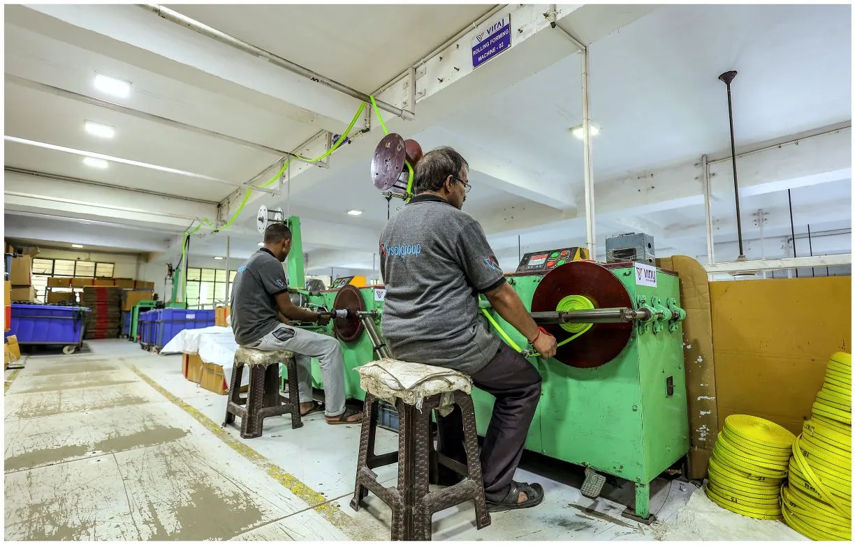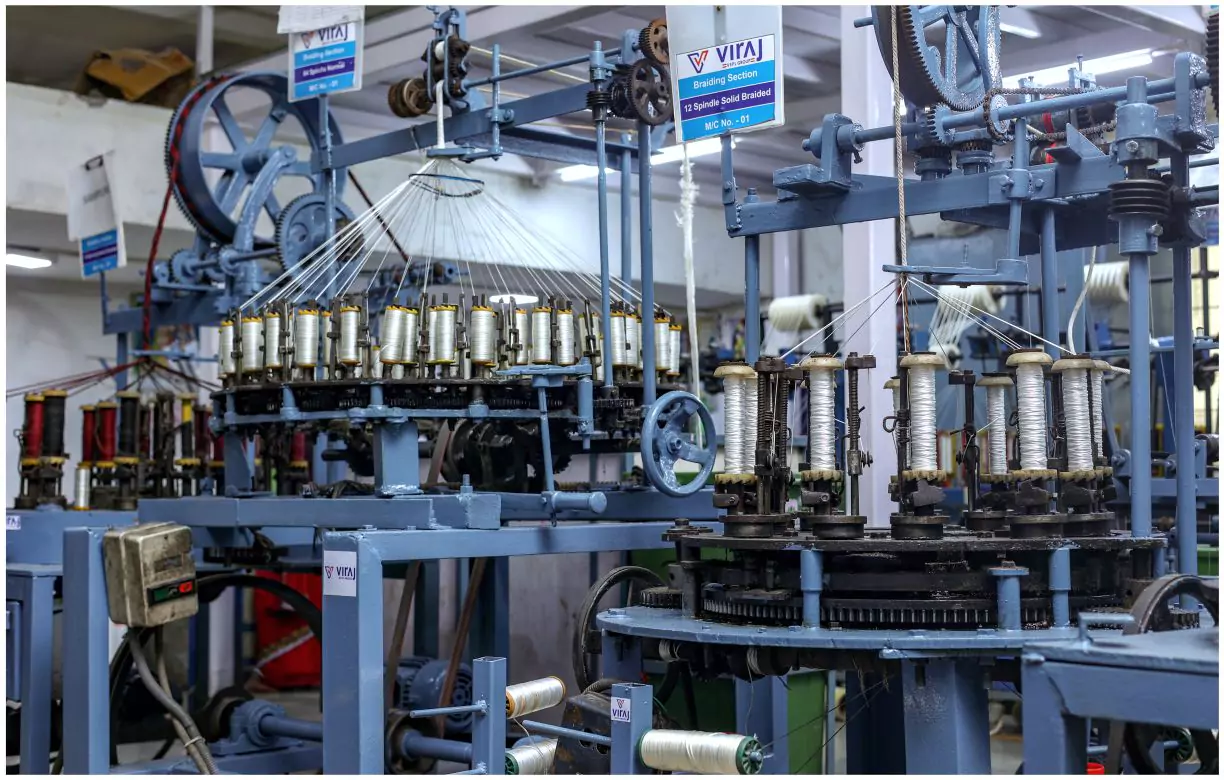 Braids are textiles formed by plaiting several yarns together diagonally (weaving is at orthogonal angles). The number of strands available for braiding at VIRAJ goes from 8 to 64.